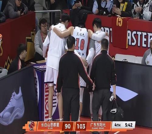 昨晚还有一个画面,个人觉得不对劲。比赛战至末节还剩5分42秒时,焦泊乔被队友胡明轩绊倒,前者显然是扭了脚,倒地后一度没有起来,最后被队友扶着单脚跳出场外。焦泊乔倒地后,等吉林进攻回合完成后,裁判吹停了比赛,此时焦泊乔还未起来,附近的队友王少杰和奎因纷纷前去看望焦泊乔,关心他的伤情。而绊倒焦泊乔的胡明轩却漠不关心,抱着球扬长而去。虽然我是广东球迷,也要对胡明轩这种冷漠的态度进行批评。